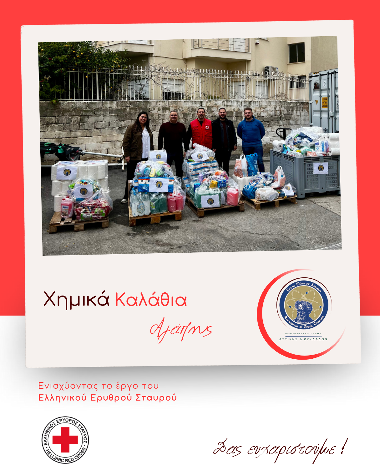 Με μεγάλη επιτυχία και μαζική συμμετοχή ολοκληρώθηκε η δράση «Χημικά Καλάθια Αγάπης», στο πλαίσιο της οποίας συγκεντρώθηκαν αγαθά – είδη πρώτης ανάγκης και υγειονομικό υλικόγια την ενίσχυση του έργου του Ελληνικού Ερυθρού Σταυρού.